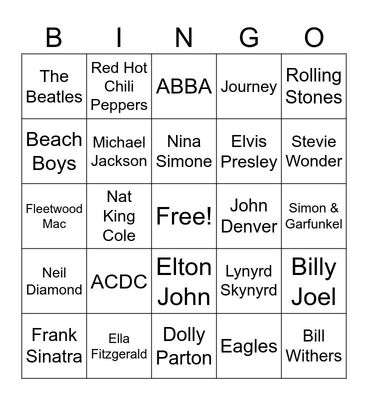 This bingo card has a free space and 24 words: ACDC, Ella Fitzgerald, Nina Simone, Frank Sinatra, Rolling Stones, The Beatles, Beach Boys, Red Hot Chili Peppers, John Denver, Elton John, Elvis Presley, Fleetwood Mac, Lynyrd Skynyrd, Billy Joel, Michael Jackson, Eagles, Simon & Garfunkel, ABBA, Stevie Wonder, Nat King Cole, Bill Withers, Neil Diamond, Journey and Dolly Parton.