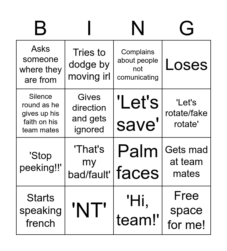 This bingo card has 16 words: 'NT', Gets mad at team mates, Complains about people not comunicating, Asks someone where they are from, 'Stop peeking!!', Tries to dodge by moving irl, Palm faces, 'Hi, team!', Silence round as he gives up his faith on his team mates, Gives direction and gets ignored, Starts speaking french, Loses, 'That's my bad/fault', 'Let's rotate/fake rotate', 'Let's save' and Free space for me!.
