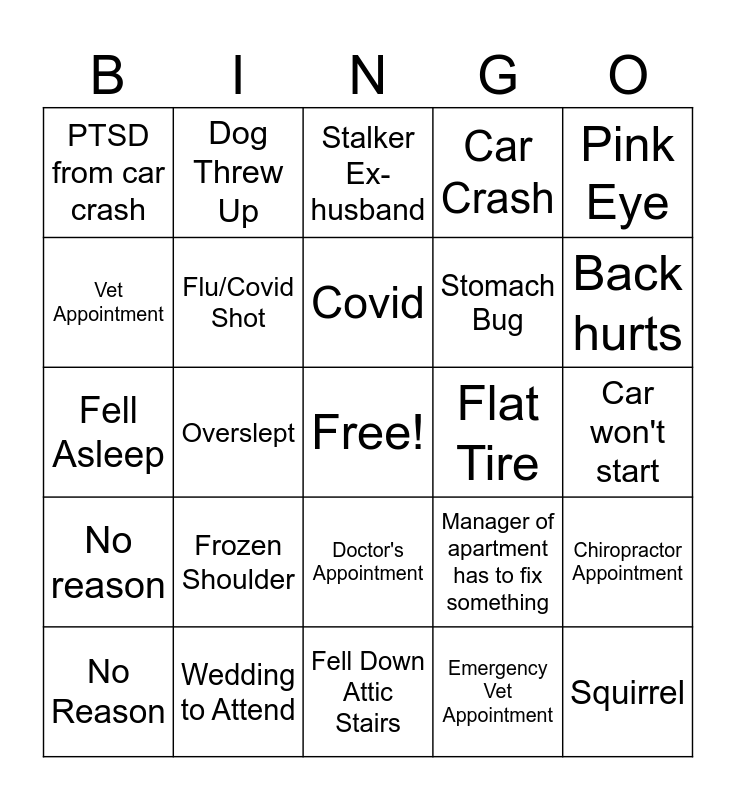 This bingo card has a free space and 24 words: Frozen Shoulder, Wedding to Attend, Covid, No Reason, Pink Eye, PTSD from car crash, Vet Appointment, Dog Threw Up, Flat Tire, Doctor's Appointment, Stomach Bug, Fell Asleep, Manager of apartment has to fix something, Chiropractor Appointment, Flu/Covid Shot, Emergency Vet Appointment, Car won't start, Stalker Ex-husband, Back hurts, Overslept, Squirrel, No reason, Car Crash and Fell Down Attic Stairs.
