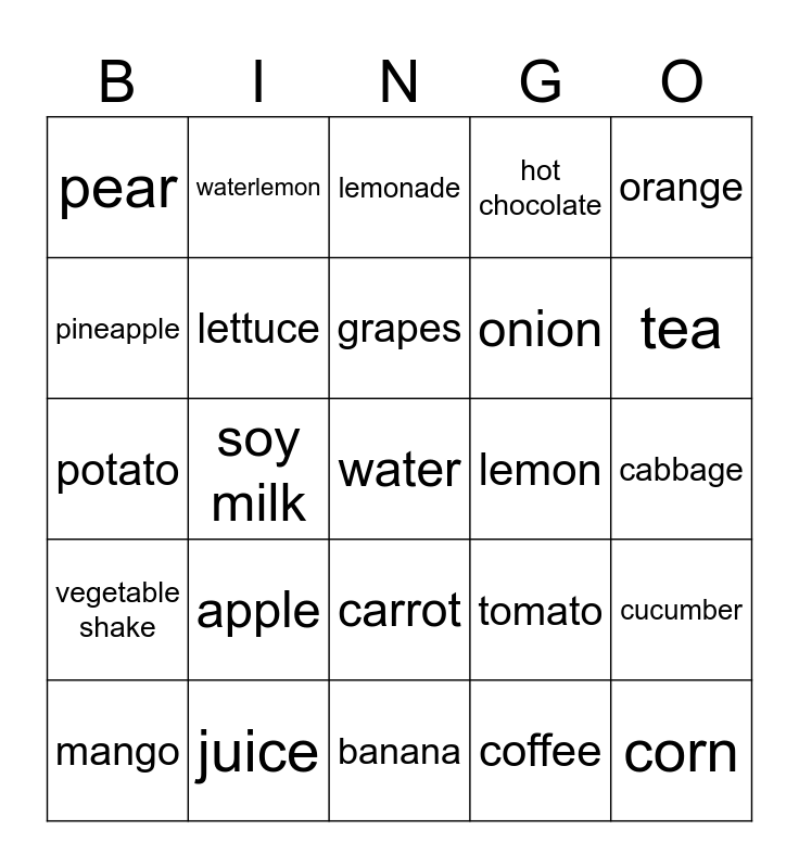 This bingo card has 25 words: apple, banana, grapes, mango, orange, pear, pineapple, waterlemon, lemon, carrot, onion, potato, tomato, cucumber, lettuce, corn, cabbage, lemonade, tea, soy milk, water, juice, vegetable shake, hot chocolate and coffee.