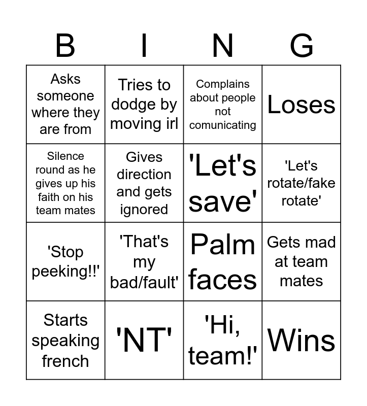 This bingo card has 16 words: 'NT', Gets mad at team mates, Complains about people not comunicating, Asks someone where they are from, 'Stop peeking!!', Tries to dodge by moving irl, Palm faces, 'Hi, team!', Silence round as he gives up his faith on his team mates, Gives direction and gets ignored, Starts speaking french, Loses, 'That's my bad/fault', 'Let's rotate/fake rotate', 'Let's save' and Wins.