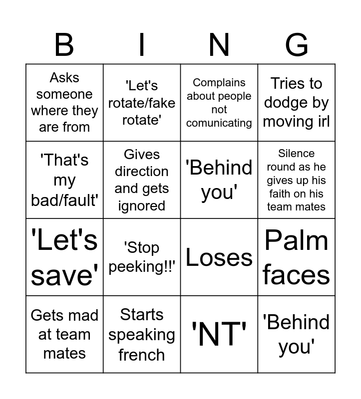 This bingo card has 17 words: 'NT', Gets mad at team mates, Complains about people not comunicating, Asks someone where they are from, 'Stop peeking!!', Tries to dodge by moving irl, Palm faces, 'Behind you', Silence round as he gives up his faith on his team mates, Gives direction and gets ignored, Starts speaking french, Loses, 'That's my bad/fault', 'Let's rotate/fake rotate', 'Let's save', Wins and 'Behind you'.