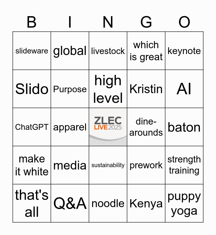 This bingo card has a free space and 27 words: prework, sofa, Kristin, noodle, Slido, livestock, global, make it white, dine-arounds, strength training, ChatGPT, which is great, that's all, Q&A, AI, Conrad, Purpose, high level, media, slideware, baton, Kenya, apparel, puppy yoga, sustainability, keynote and ztracks.