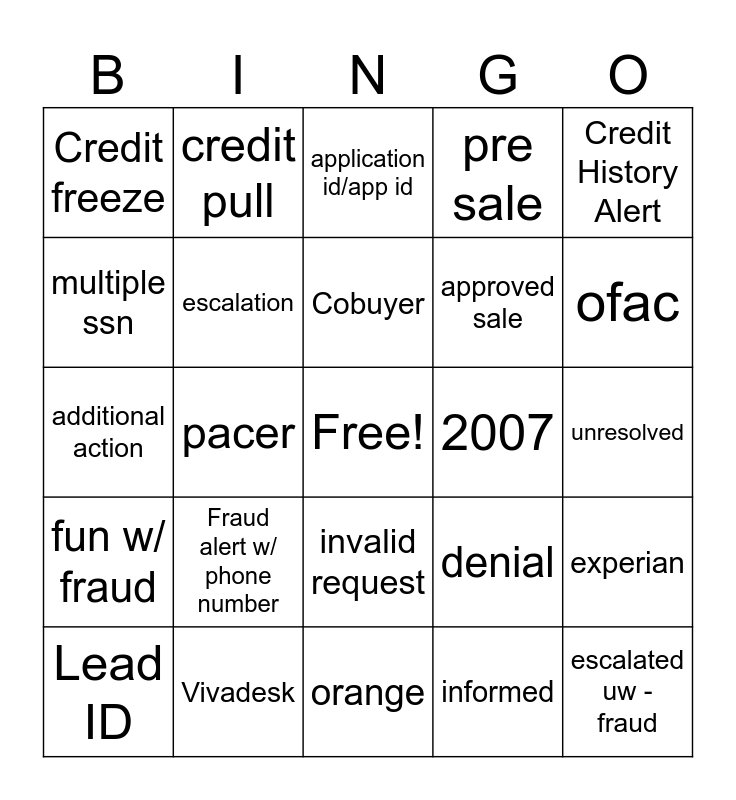 This bingo card has a free space and 24 words: Fraud alert w/ phone number, Vivadesk, Cobuyer, Lead ID, Credit History Alert, Credit freeze, multiple ssn, credit pull, 2007, invalid request, approved sale, additional action, denial, experian, escalation, informed, unresolved, application id/app id, ofac, pacer, escalated uw - fraud, fun w/ fraud, pre sale and orange.