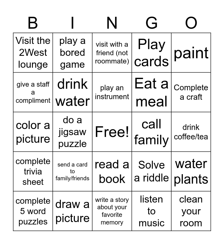 This bingo card has a free space and 29 words: complete 5 word puzzles, do seated exercise in your room, do a jigsaw puzzle, watch a movie, Visit the 2West lounge, visit with a friend (not roommate), drink water, send a card to family/friends, call family, draw a picture, drink coffee/tea, clean your room, write a story about your favorite memory, listen to music, Complete a craft, read a magazine, read a book, complete trivia sheet, paint, color a picture, Solve a riddle, Sing a song, Eat a meal, give a staff a compliment, Play cards, play a bored game, water plants, play an instrument and come up with a new activity that can be added to future activity calendar.