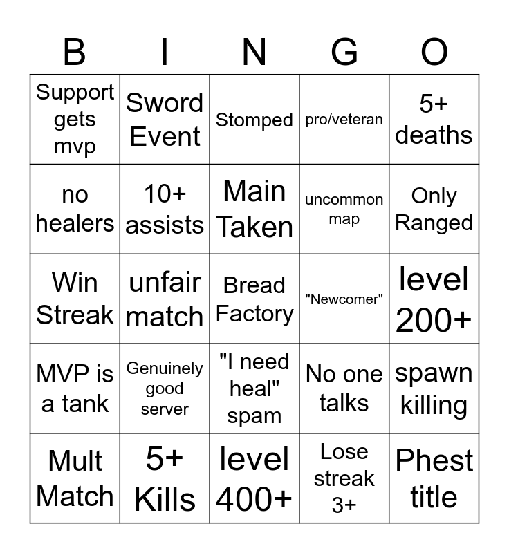 This bingo card has a free space and 34 words: Banana, Lose streak 3+, 3+ supports, MVP, MVP is a tank, 10+ assists, 5+ deaths, Mult Match, Sword Event, 0 Kills, Main Taken, Stomped, 0 Deaths, Newcomer, "Newcomer", Only Ranged, 5+ Kills, Win Streak, Genuinely good server, No one talks, "I need heal" spam, Target Spam, Support gets mvp, level 200+, level 400+, Phest title, pro/veteran, escort, uncommon map, no healers, coil, unfair match, spawn killing and no one on point.