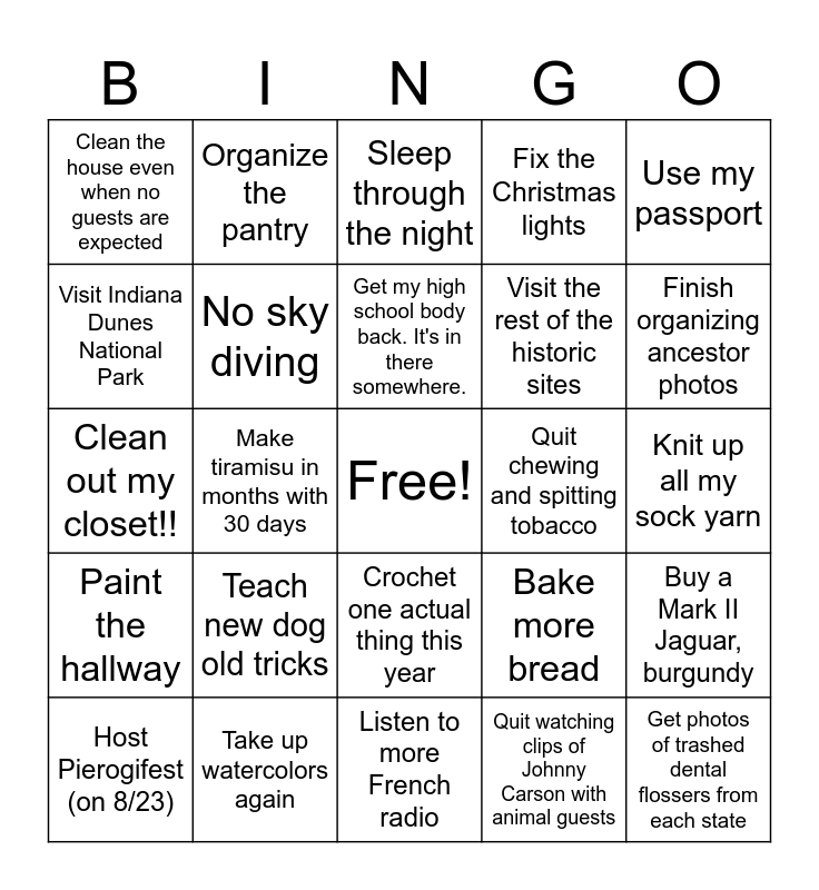 This bingo card has a free space and 29 words: Host Pierogifest (on 8/23), Put laundry away within 2 biz days of washing, Make tiramisu in months with 30 days, Use my Costco sized spinach B4 it expires, Clean the house even when no guests are expected, Sleep through the night, No sky diving, Teach new dog old tricks, Quit chewing and spitting tobacco, Take up watercolors again, Knit up all my sock yarn, Get photos of trashed dental flossers from each state, Listen to more French radio, Quit watching clips of Johnny Carson with animal guests, Finish organizing ancestor photos, Start pilates, Crochet one actual thing this year, Paint the hallway, Use my passport, Clean out my closet!!, Bake more bread, Visit the Northwest, Visit the rest of the historic sites, Visit Indiana Dunes National Park, Fix the Christmas lights, Organize the pantry, Buy a Mark II Jaguar, burgundy, Get my high school body back. It's in there somewhere. and Find the other half of my wit..