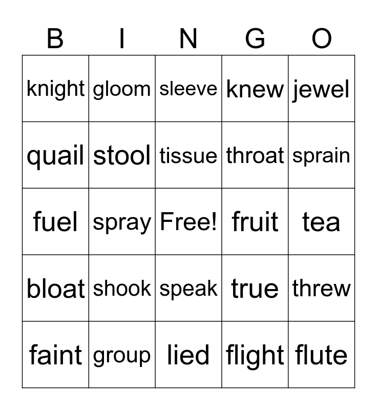 This bingo card has a free space and 24 words: shook, group, tissue, faint, jewel, knight, quail, gloom, fruit, speak, throat, fuel, true, threw, stool, flight, tea, sleeve, sprain, spray, flute, bloat, knew and lied.