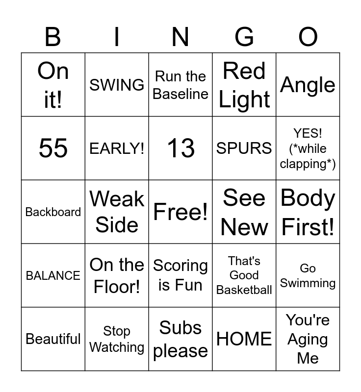 This bingo card has a free space and 35 words: Swiper, NO SWIPING!, Move the Ball, MOTION, EARLY!, Scoring is Fun, Red Light, 55, 5!, 13, Raptor, Backboard, Angle, Call the Screen, BOX OUT, On it!, See New, HOME, Weak Side, BALANCE, You're Aging Me, That's Good Basketball, Beautiful, Go Swimming, Stop Watching, Run the Baseline, YES! (*while clapping*), No Rainbows, LAKERS, SPURS, Body First!, BIG!!, Subs please, On the Floor!, SWING and North/South.