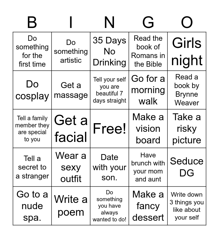 This bingo card has a free space and 24 words: Wear a sexy outfit, Write a poem, Tell your self you are beautiful 7 days straight, Go to a nude spa., Girls night, Do something for the first time, Do cosplay, Do something artistic, Make a vision board, Date with your son., Go for a morning walk, Tell a family member they are special to you, Have brunch with your mom and aunt, Seduce DG, Get a massage, Make a fancy dessert, Take a risky picture, 35 Days No Drinking, Read a book by Brynne Weaver, Get a facial, Write down 3 things you like about your self, Tell a secret to a stranger, Read the book of Romans in the Bible and Do something you have always wanted to do!.
