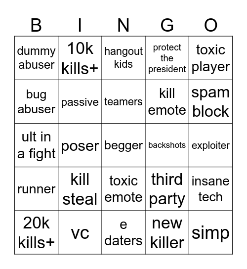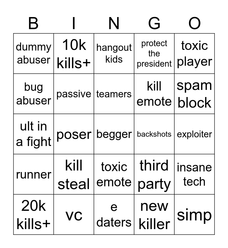 This bingo card has a free space and 34 words: killstreak, new killer, targetter, get frozen soul, runner, passive, toxic player, 20k kills+, 10k kills+, alt account, teamers, hangout kids, wild psychic, gooner, backshots, spam block, vc, ult in a fight, kill steal, third party, toxic emote, large range move, dummy abuser, exploiter, e daters, simp, protect the president, cartoony rainbow avatar, kill emote, bug abuser, title, poser, insane tech and complainer.