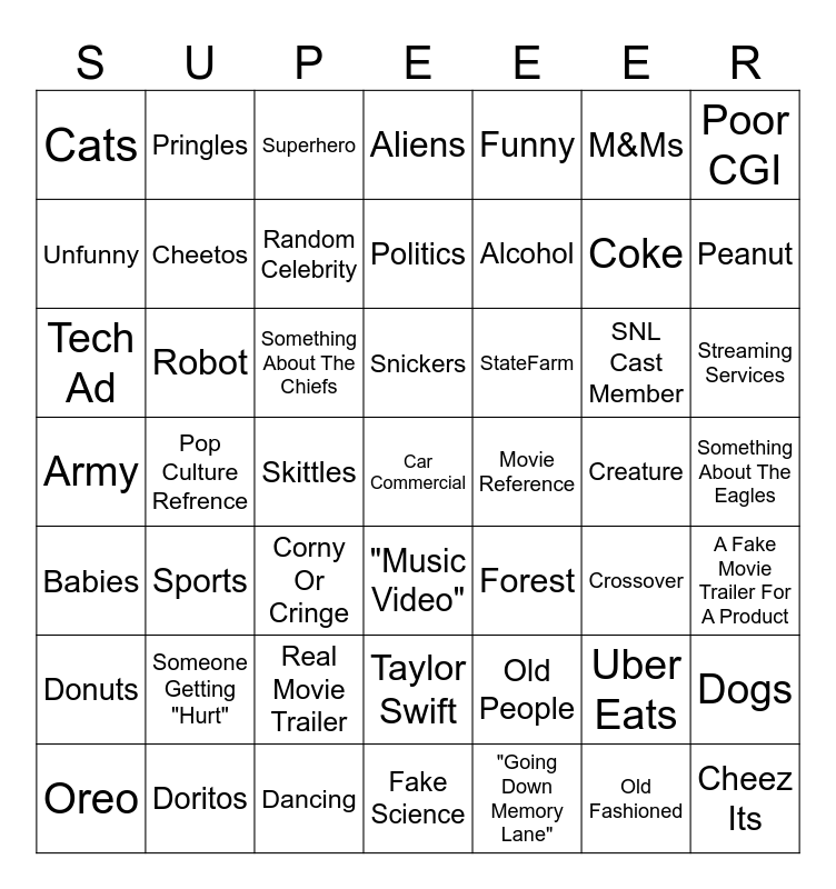 This bingo card has a free space and 48 words: Old People, Coke, Fake Science, Pop Culture Refrence, Something About The Chiefs, Something About The Eagles, Pringles, Doritos, M&Ms, "Music Video", Poor CGI, Aliens, SNL Cast Member, StateFarm, Donuts, Creature, Unfunny, Peanut, Uber Eats, Funny, Alcohol, Skittles, Cats, Cheetos, Dogs, Random Celebrity, Streaming Services, Oreo, Snickers, Robot, Old Fashioned, Movie Reference, A Fake Movie Trailer For A Product, Someone Getting "Hurt", Army, Forest, Crossover, Tech Ad, Corny Or Cringe, Real Movie Trailer, Babies, Cheez Its, Superhero, Dancing, Politics, Taylor Swift, Sports and "Going Down Memory Lane".