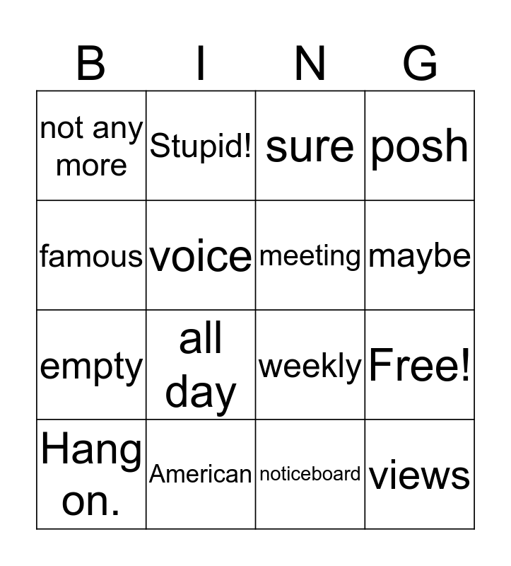 This bingo card has 20 words: Free!, little fella, sure, lost (to be...), Hang on., famous, American, not any more, empty, Stupid!, all day, weekly, voice, views, meeting, the web, maybe, posh, noticeboard and start-up meeting.