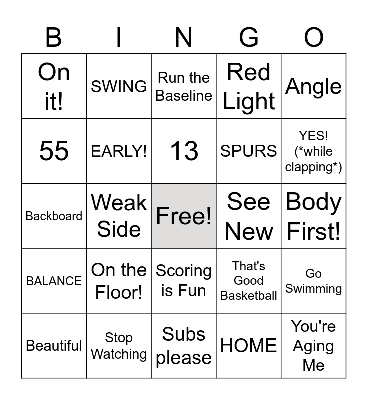 This bingo card has a free space and 35 words: Swiper, NO SWIPING!, Move the Ball, MOTION, EARLY!, Scoring is Fun, Red Light, 55, 5!, 13, Raptor, Backboard, Angle, Call the Screen, BOX OUT, On it!, See New, HOME, Weak Side, BALANCE, You're Aging Me, That's Good Basketball, Beautiful, Go Swimming, Stop Watching, Run the Baseline, YES! (*while clapping*), No Rainbows, LAKERS, SPURS, Body First!, BIG!!, Subs please, On the Floor!, SWING and North/South.