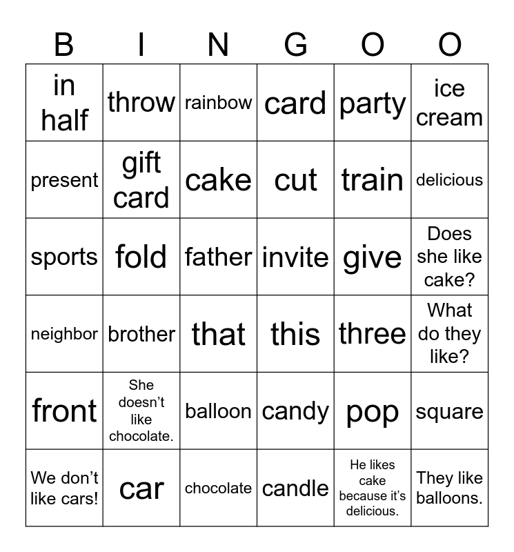 This bingo card has 36 words: candy, balloon, candle, present, neighbor, invite, gift card, chocolate, party, pop, delicious, card, square, fold, cut, in half, front, give, sports, rainbow, father, brother, this, that, three, throw, train, car, cake, ice cream, They like balloons., We don’t like cars!, What do they like?, Does she like cake?, She doesn’t like chocolate. and He likes cake because it’s delicious..