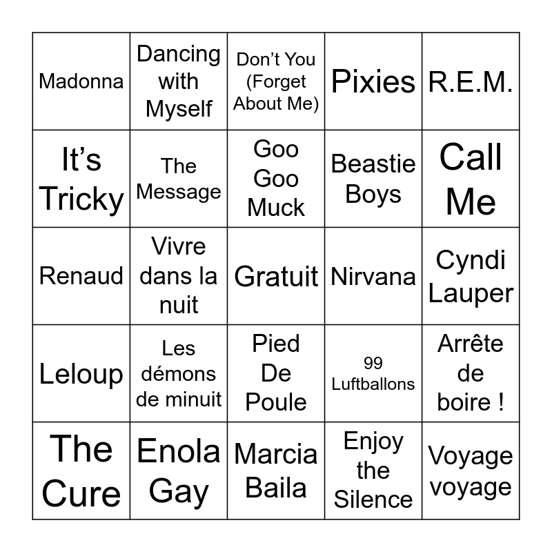 This bingo card has a free space and 43 words: Big in Japan, Voyage voyage, Bowie, The Cure, The Smiths, Enjoy the Silence, Don’t You (Forget About Me), Mad World, R.E.M., Enola Gay, Pixies, Nirvana, Pied De Poule, Les démons de minuit, Ella, elle l’a, Marcia Baila, Nuit de folie, Renaud, Psycho Killer, Call Me, Dancing with Myself, Joy Division, The Clash, Madonna, Michael Jackson, Cyndi Lauper, Sweet Dreams, Don’t You Want Me, 99 Luftballons, Leloup, Indochine, Arrête de boire !, Ilégal, Vivre dans la nuit, Oxygène, Je m’en souviens, Les bombes, Goo Goo Muck, It’s Tricky, Beastie Boys, Bring The Noise, The Message and N.W.A..