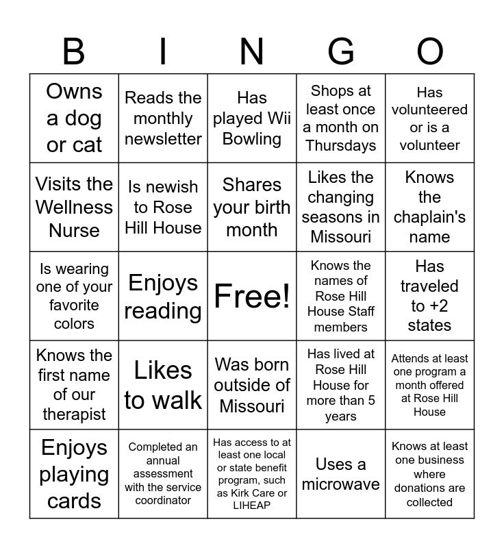 This bingo card has a free space and 24 words: Enjoys playing cards, Likes to walk, Shares your birth month, Uses a microwave, Has volunteered or is a volunteer, Owns a dog or cat, Reads the monthly newsletter, Has played Wii Bowling, Knows the names of Rose Hill House Staff members, Has traveled to +2 states, Is wearing one of your favorite colors, Is newish to Rose Hill House, Has lived at Rose Hill House for more than 5 years, Attends at least one program a month offered at Rose Hill House, Visits the Wellness Nurse, Completed an annual assessment with the service coordinator, Has access to at least one local or state benefit program, such as Kirk Care or LIHEAP, Shops at least once a month on Thursdays, Knows the chaplain's name, Knows the first name of our therapist, Enjoys reading, Was born outside of Missouri, Likes the changing seasons in Missouri and Knows at least one business where donations are collected.