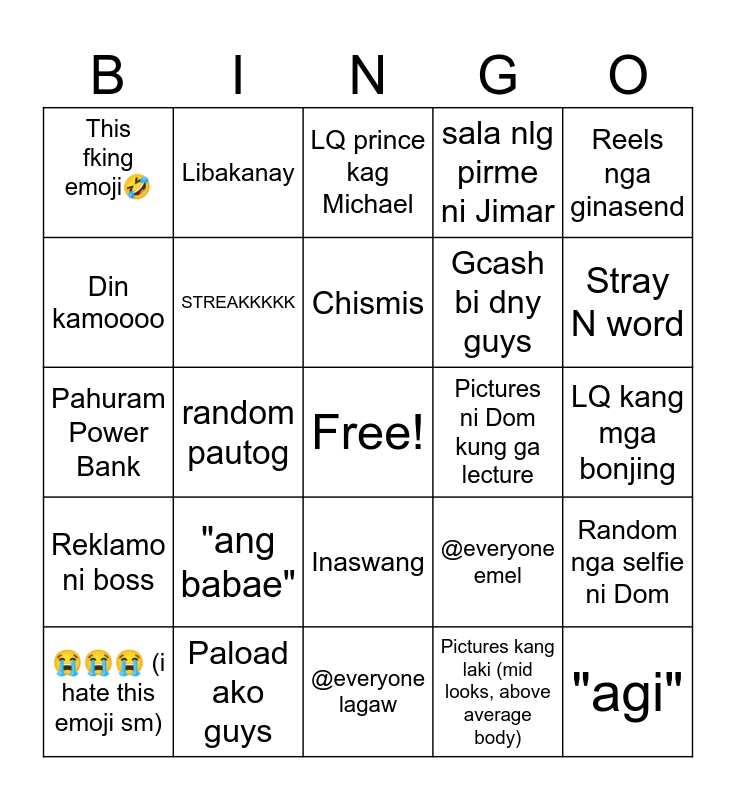 This bingo card has a free space and 24 words: "ang babae", Paload ako guys, Chismis, ðŸ˜ðŸ˜ðŸ˜ (i hate this emoji sm), Reels nga ginasend, This fking emoji🤣, Din kamoooo, Libakanay, Pictures ni Dom kung ga lecture, Inaswang, Gcash bi dny guys, Pahuram Power Bank, @everyone emel, Random nga selfie ni Dom, STREAKKKKK, Pictures kang laki (mid looks, above average body), LQ kang mga bonjing, LQ prince kag Michael, Stray N word, random pautog, "agi", Reklamo ni boss, sala nlg pirme ni Jimar and @everyone lagaw.