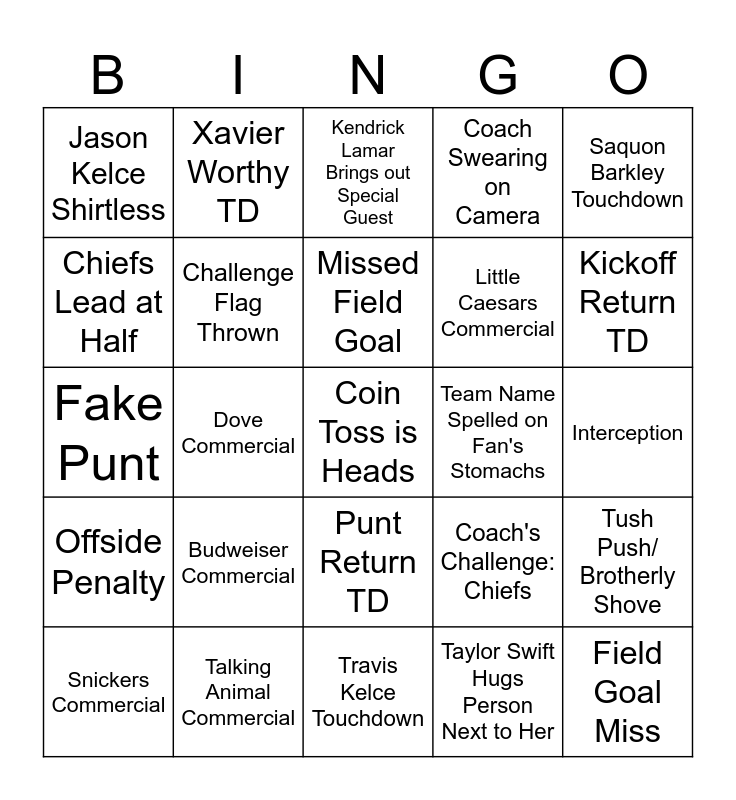 This bingo card has 42 words: Free!, Missed Field Goal, Mahomes Sacked, Budweiser Commercial, Taylor Swift Hugs Person Next to Her, Tush Push/ Brotherly Shove, Coin Toss is Heads, Coin Toss is Tails, Kendrick Lamar Brings out Special Guest, Punt Return TD, Interception, Kickoff Return TD, Dove Commercial, Saquon Barkley Touchdown, 'Not Like Us' at Halftime, Coach's Challenge: Chiefs, Doritos Commercial, Fake Punt, Mahomes Rushing TD, Xavier Worthy TD, Chiefs Lead at Half, Eagles Lead at Half, Field Goal Miss, Jason Kelce Shirtless, 2-Point Conversion, Door Dash Commercial, Little Caesars Commercial, 35+ YD Pass, Player Crying, Tom Brady Super Bowl Highlights Shown, 40+ Yd Field Goal, Offside Penalty, Challenge Flag Thrown, Travis Kelce Touchdown, DeVonta Smith Touchdown, Snickers Commercial, Talking Animal Commercial, Team Name Spelled on Fan's Stomachs, Safety, 40+ Yd Run, Coach Swearing on Camera and Announcers Use the Word "GOAT".