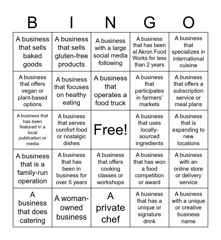 This bingo card has a free space and 24 words: A business that has been in business for over 5 years, A woman-owned business, A business that operates a food truck, A business that does catering, A business that specializes in international cuisine, A business that sells baked goods, A business that offers vegan or plant-based options, A business that sells gluten-free products, A business that uses locally-sourced ingredients, A business that offers cooking classes or workshops, A business that participates in farmers' markets, A business that has been featured in a local publication or media, A business that has won a food competition or award, A business with an online store or delivery service, A business that focuses on healthy eating, A business that has a unique or signature drink, A business that is expanding to new locations, A business with a large social media following, A business that offers a subscription service or meal plans, A business that serves comfort food or nostalgic dishes, A business with a unique or creative business name, A business that is a family-run operation, A business that has been at Akron Food Works for less than 2 years and A private chef.