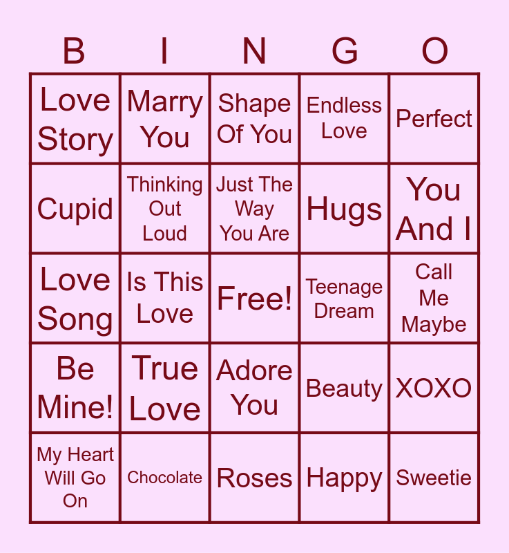This bingo card has a free space and 25 words: True Love, Roses, Just The Way You Are, My Heart Will Go On, Perfect, Love Story, Cupid, Marry You, Teenage Dream, Adore You, Hugs, Love Song, Beauty, XOXO, Thinking Out Loud, Candy Hearts, Call Me Maybe, Shape Of You, You And I, Is This Love, Sweetie, Chocolate, Be Mine!, Endless Love and Happy.