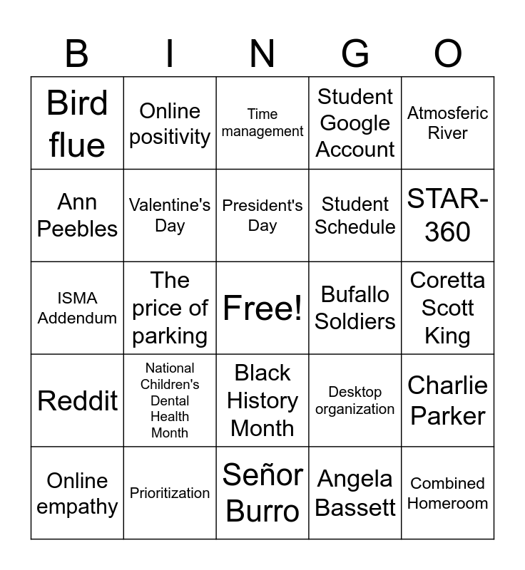 This bingo card has a free space and 26 words: Black History Month, Angela Bassett, President's Day, Prioritization, Atmosferic River, Bird flue, Ann Peebles, Online positivity, Coretta Scott King, Desktop organization, Student Schedule, ISMA Addendum, Charlie Parker, Online empathy, The price of parking, The price of eggs, Student Google Account, Reddit, Time management, Combined Homeroom, STAR-360, Señor Burro, Bufallo Soldiers, National Children's Dental Health Month, Valentine's Day and Quinceañera (Nissi).