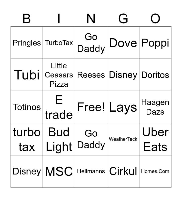 This bingo card has a free space and 24 words: Bud Light, MSC, Reeses, Disney, Poppi, Pringles, Tubi, TurboTax, Lays, Go Daddy, Disney, Totinos, WeatherTeck, Uber Eats, Little Ceasars Pizza, Cirkul, Haagen Dazs, Go Daddy, Doritos, E trade, Homes.Com, turbo tax, Dove and Hellmanns.