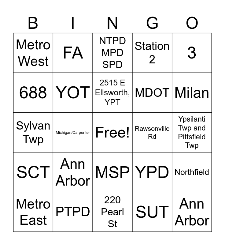 This bingo card has a free space and 24 words: Ann Arbor, PTPD, 2515 E Ellsworth, YPT, Metro East, 3, Metro West, 688, FA, Rawsonville Rd, MSP, MDOT, Sylvan Twp, YPD, Northfield, YOT, SUT, Ypsilanti Twp and Pittsfield Twp, NTPD MPD SPD, Milan, Michigan/Carpenter, Ann Arbor, SCT, Station 2 and 220 Pearl St.