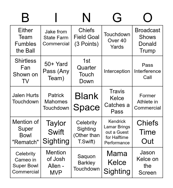 This bingo card has a free space and 24 words: Taylor Swift Sighting, Mention of Josh Allen - MVP, 1st Quarter Touch Down, Celebrity Cameo in Super Bowl Commercial, Broadcast Shows Donald Trump, Either Team Fumbles the Ball, Shirtless Fan Shown on TV, Jake from State Farm Commercial, Travis Kelce Catches a Pass, Celebrity Sighting (Other than T.Swift), Interception, Jalen Hurts Touchdown, Kendrick Lamar Brings out a Guest for Halftime Performance, Chiefs Time Out, 50+ Yard Pass (Any Team), Mama Kelce Sighting, Former Athlete in Commercial, Chiefs Field Goal (3 Points), Pass Interference Call, Patrick Mahomes Touchdown, Jason Kelce on the Screen, Mention of Super Bowl "Rematch", Touchdown Over 40 Yards and Saquon Barkley Touchdown.