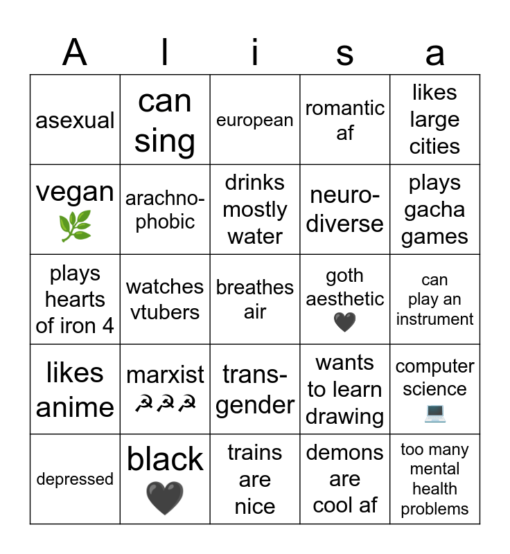 This bingo card has a free space and 24 words: marxist ☭☭☭, black 🖤, drinks mostly water, depressed, likes large cities, asexual, vegan 🌿, can sing, goth aesthetic🖤, trans-gender, neuro-diverse, plays hearts of iron 4, wants to learn drawing, computer science 💻, arachno-phobic, demons are cool af, can play an instrument, european, plays gacha games, watches vtubers, too many mental health problems, likes anime, romantic af and trains are nice.