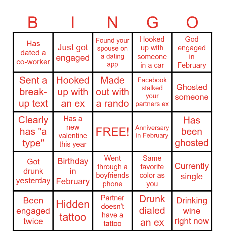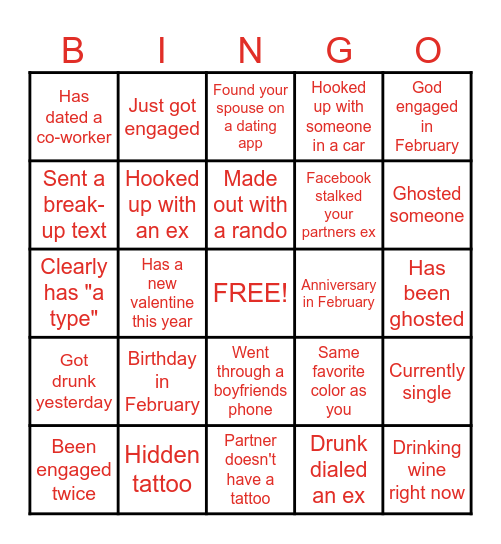 This bingo card has a free space and 24 words: Birthday in February, Hidden tattoo, Made out with a rando, Been engaged twice, God engaged in February, Has dated a co-worker, Sent a break-up text, Just got engaged, Anniversary in February, Went through a boyfriends phone, Facebook stalked your partners ex, Clearly has "a type", Same favorite color as you, Currently single, Hooked up with an ex, Drunk dialed an ex, Has been ghosted, Found your spouse on a dating app, Ghosted someone, Has a new valentine this year, Drinking wine right now, Got drunk yesterday, Hooked up with someone in a car and Partner doesn't have a tattoo.