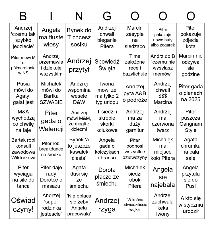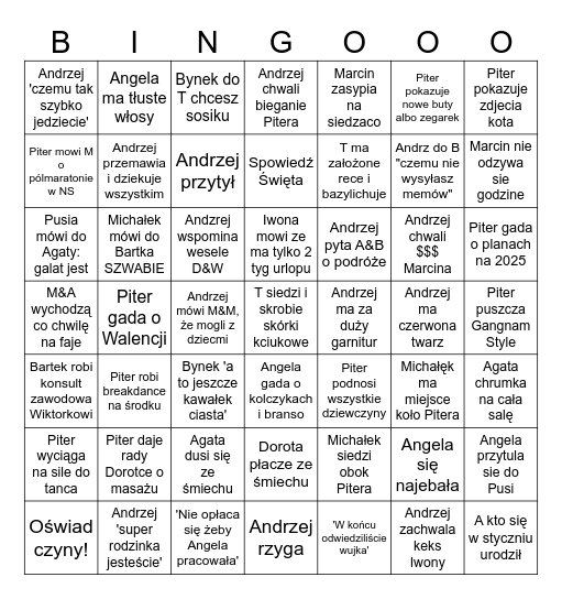 This bingo card has 49 words: Angela się najebała, Andrz do B "czemu nie wysyłasz memów", 'W końcu odwiedziliście wujka', Piter gada o Walencji, Andzrej wspomina wesele D&W, Piter puszcza Gangnam Style, Angela ma tłuste włosy, 'Nie opłaca się żeby Angela pracowała', Piter pokazuje nowe buty albo zegarek, Angela gada o kolczykach i branso, Piter pokazuje zdjecia kota, Andrzej chwali bieganie Pitera, Andrzej chwali $$$ Marcina, Andrzej pyta A&B o podróże, Piter daje rady Dorotce o masażu, Andrzej ma czerwona twarz, Piter mowi M o pólmaratonie w NS, Marcin nie odzywa sie godzine, Angela przytula sie do Pusi, Marcin zasypia na siedzaco, T ma założone rece i bazylichuje, Andrzej mówi M&M, że mogli z dziecmi, Andrzej 'czemu tak szybko jedziecie', Andrzej przemawia i dziekuje wszystkim, Oświad czyny!, Andrzej przytył, Piter gada o planach na 2025, Andrzej 'super rodzinka jesteście', Iwona mowi ze ma tylko 2 tyg urlopu, Michałek mówi do Bartka SZWABIE, A kto się w styczniu urodził, Andrzej ma za duży garnitur, Piter wyciąga na sile do tanca, Agata dusi się ze śmiechu, M&A wychodzą co chwilę na faje, Piter podnosi wszystkie dziewczyny, Michałęk ma miejsce koło Pitera, Agata chrumka na cała salę, Pusia mówi do Agaty: galat jest, Bynek 'a to jeszcze kawałek ciasta', Dorota płacze ze śmiechu, Bartek robi konsult zawodowa Wiktorkowi, T siedzi i skrobie skórki kciukowe, Andrzej rzyga, Spowiedź Święta, Bynek do T chcesz sosiku, Michałek siedzi obok Pitera, Piter robi breakdance na środku and Andrzej zachwala keks Iwony.