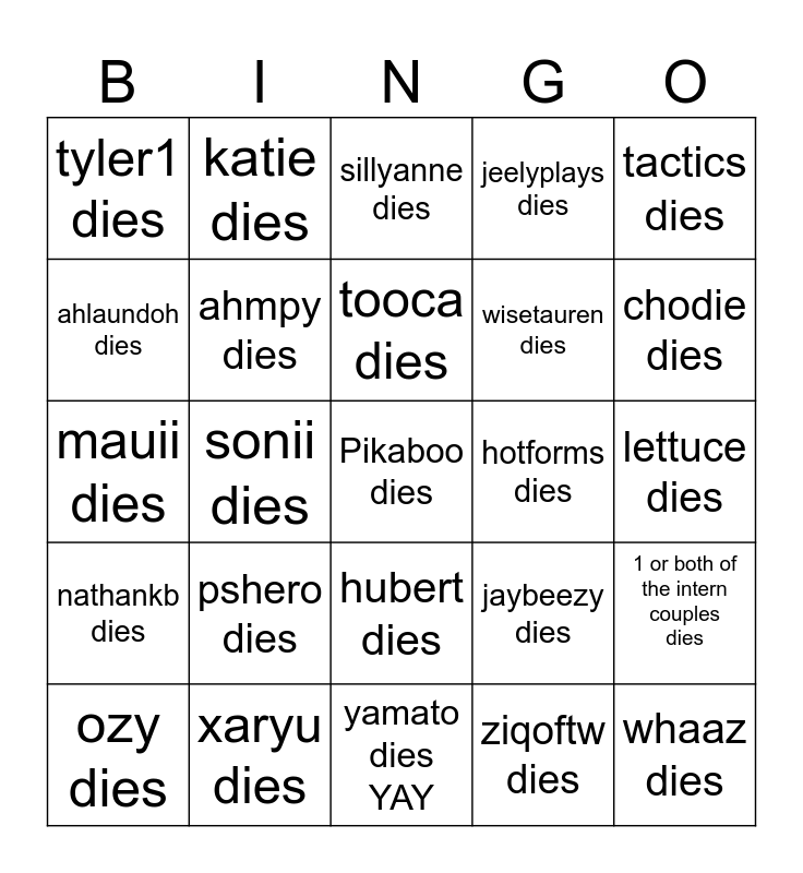 This bingo card has a free space and 24 words: pshero dies, xaryu dies, tooca dies, ozy dies, tactics dies, tyler1 dies, ahlaundoh dies, katie dies, hotforms dies, hubert dies, wisetauren dies, mauii dies, jaybeezy dies, 1 or both of the intern couples dies, ahmpy dies, ziqoftw dies, lettuce dies, sillyanne dies, chodie dies, sonii dies, whaaz dies, nathankb dies, jeelyplays dies and yamato dies YAY.