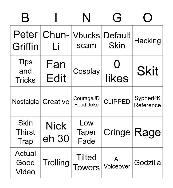 This bingo card has 25 words: Nick eh 30, Tilted Towers, Cosplay, Actual Good Video, Hacking, Peter Griffin, Tips and Tricks, Chun-Li, CLIPPED, Low Taper Fade, 0 likes, Nostalgia, Cringe, Rage, Fan Edit, Godzilla, SypherPK Reference, Vbucks scam, Skit, Creative, CourageJD Food Joke, Trolling, Skin Thirst Trap, Default Skin and AI Voiceover.