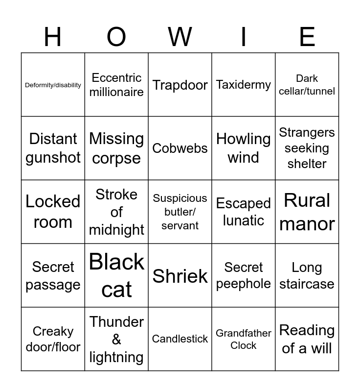 This bingo card has 25 words: Black cat, Candlestick, Cobwebs, Creaky door/floor, Dark cellar/tunnel, Deformity/disability, Distant gunshot, Eccentric millionaire, Escaped lunatic, Shriek, Howling wind, Locked room, Secret peephole, Long staircase, Missing corpse, Reading of a will, Rural manor, Trapdoor, Strangers seeking shelter, Stroke of midnight, Suspicious butler/ servant, Thunder & lightning, Secret passage, Taxidermy and Grandfather Clock.