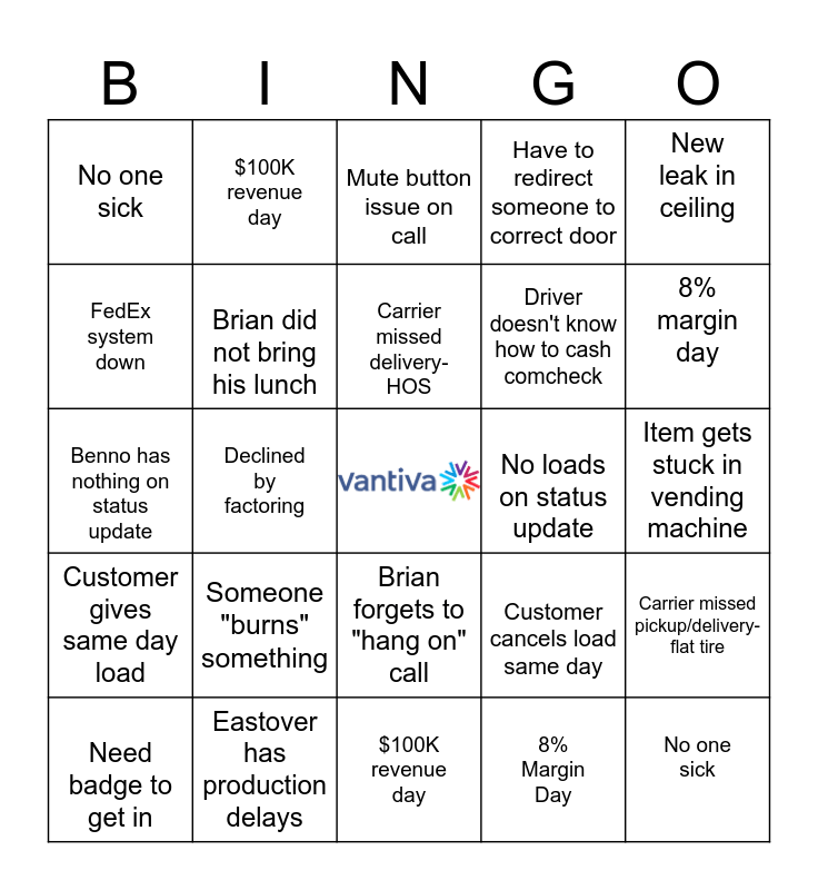 This bingo card has a free space and 24 words: Need badge to get in, Someone "burns" something, Carrier missed delivery- HOS, 8% Margin Day, New leak in ceiling, No one sick, $100K revenue day, Mute button issue on call, No loads on status update, Item gets stuck in vending machine, Benno has nothing on status update, Brian did not bring his lunch, Customer cancels load same day, Carrier missed pickup/delivery- flat tire, FedEx system down, Eastover has production delays, $100K revenue day, Have to redirect someone to correct door, 8% margin day, Customer gives same day load, Declined by factoring, Brian forgets to "hang on" call, Driver doesn't know how to cash comcheck and No one sick.