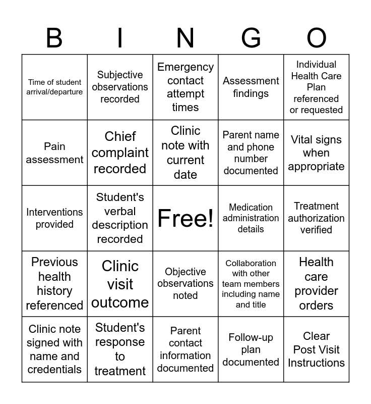 This bingo card has a free space and 24 words: Clinic visit outcome, Student's response to treatment, Clinic note with current date, Clinic note signed with name and credentials, Individual Health Care Plan referenced or requested, Time of student arrival/departure, Pain assessment, Subjective observations recorded, Medication administration details, Objective observations noted, Parent name and phone number documented, Interventions provided, Collaboration with other team members including name and title, Health care provider orders, Chief complaint recorded, Follow-up plan documented, Treatment authorization verified, Emergency contact attempt times, Vital signs when appropriate, Student's verbal description recorded, Clear Post Visit Instructions, Previous health history referenced, Assessment findings and Parent contact information documented.