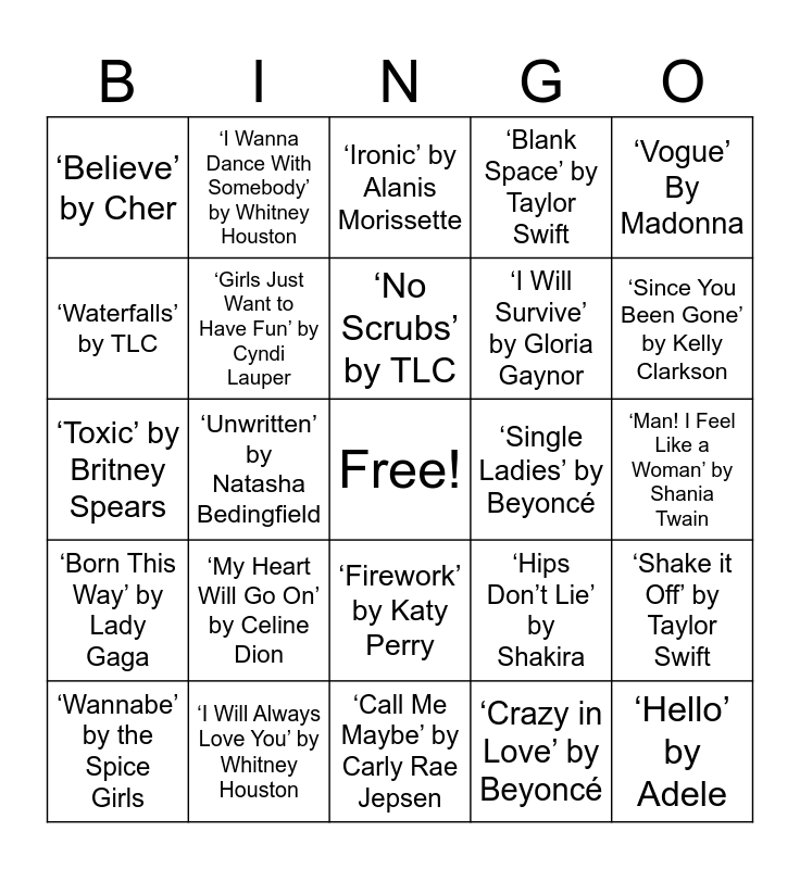 This bingo card has a free space and 24 words: ‘My Heart Will Go On’ by Celine Dion, ‘I Will Always Love You’ by Whitney Houston, ‘No Scrubs’ by TLC, ‘Wannabe’ by the Spice Girls, ‘Vogue’ By Madonna, ‘Believe’ by Cher, ‘Waterfalls’ by TLC, ‘I Wanna Dance With Somebody’ by Whitney Houston, ‘Single Ladies’ by Beyoncé, ‘Firework’ by Katy Perry, ‘I Will Survive’ by Gloria Gaynor, ‘Toxic’ by Britney Spears, ‘Hips Don’t Lie’ by Shakira, ‘Shake it Off’ by Taylor Swift, ‘Girls Just Want to Have Fun’ by Cyndi Lauper, ‘Crazy in Love’ by Beyoncé, ‘Man! I Feel Like a Woman’ by Shania Twain, ‘Ironic’ by Alanis Morissette, ‘Since You Been Gone’ by Kelly Clarkson, ‘Unwritten’ by Natasha Bedingfield, ‘Hello’ by Adele, ‘Born This Way’ by Lady Gaga, ‘Blank Space’ by Taylor Swift and ‘Call Me Maybe’ by Carly Rae Jepsen.