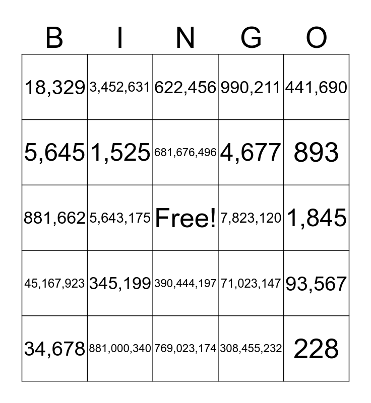 This bingo card has a free space and 24 words: 345,199, 881,000,340, 681,676,496, 34,678, 441,690, 18,329, 5,645, 3,452,631, 7,823,120, 390,444,197, 4,677, 881,662, 71,023,147, 93,567, 1,525, 308,455,232, 1,845, 622,456, 893, 5,643,175, 228, 45,167,923, 990,211 and 769,023,174.