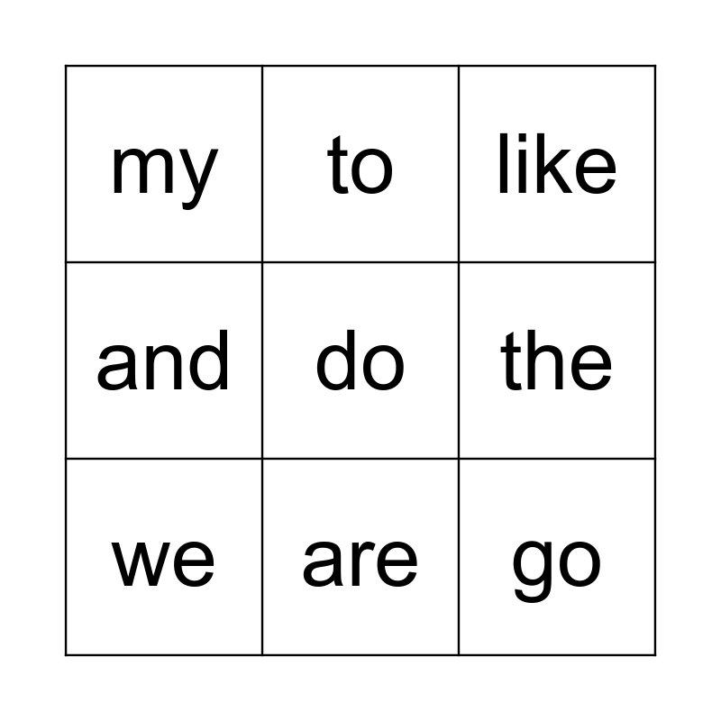 This bingo card has 14 words: I, do, go, and, to, like, you, can, a, my, are, the, we and see.