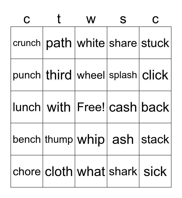 This bingo card has a free space and 39 words: chair, them, whale, ash, stack, bench, with, when, cash, back, punch, path, shore, click, lunch, thump, whip, share, flick, chore, third, wheel, shark, stuck, cheer, cloth, what, wash, neck, crunch, chest, whistle, splash, sick, such, champ, white, slush and duck.