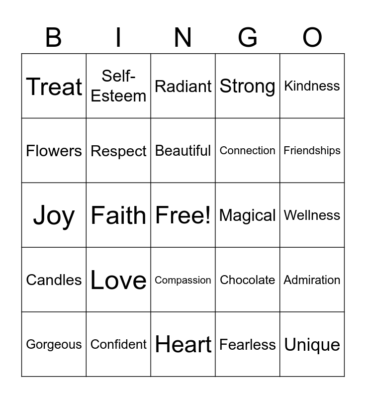 This bingo card has a free space and 24 words: Love, Confident, Beautiful, Gorgeous, Kindness, Treat, Flowers, Self-Esteem, Magical, Compassion, Connection, Joy, Chocolate, Admiration, Respect, Fearless, Wellness, Radiant, Friendships, Faith, Unique, Candles, Strong and Heart.