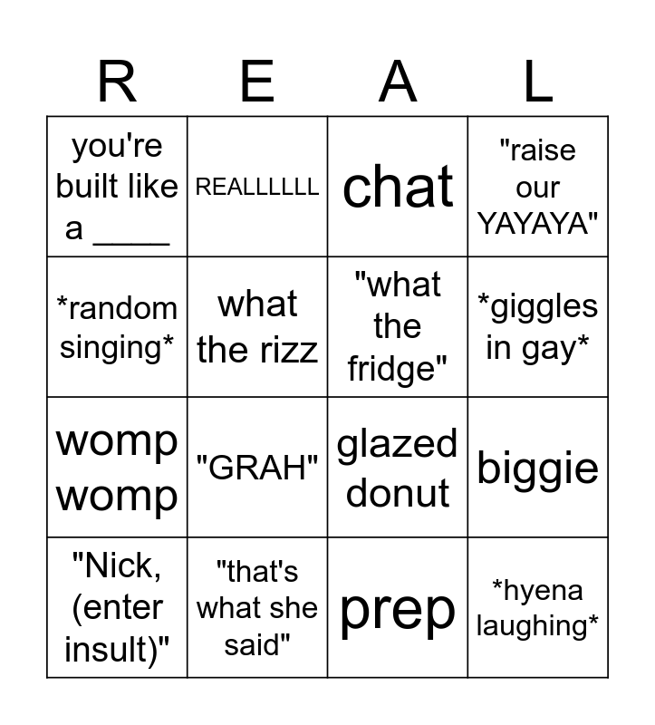 This bingo card has 16 words: "that's what she said", biggie, chat, you're built like a ____, womp womp, REALLLLLL, glazed donut, prep, *random singing*, what the rizz, "Nick, (enter insult)", "raise our YAYAYA", "GRAH", *giggles in gay*, "what the fridge" and *hyena laughing*.