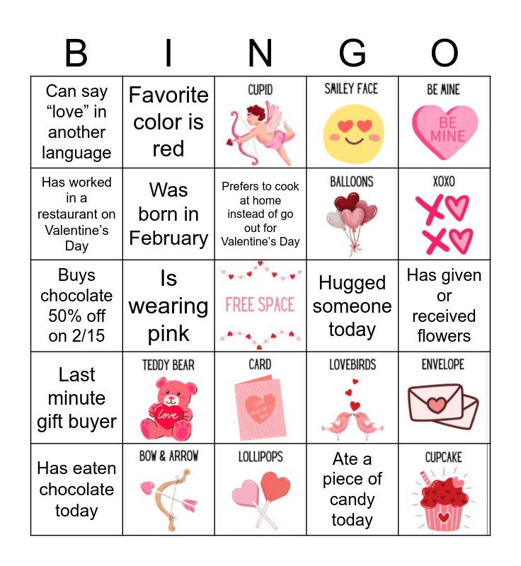 This bingo card has 15 images, a free space and 14 words: Has eaten chocolate today, Is wearing pink, Can say “love” in another language, Was born in February, Hugged someone today, Has given or received flowers, Ate a piece of candy today, Has written a love letter, Last minute gift buyer, Buys chocolate 50% off on 2/15, Loves romance movies, Has worked in a restaurant on Valentine’s Day, Favorite color is red and Prefers to cook at home instead of go out for Valentine’s Day.