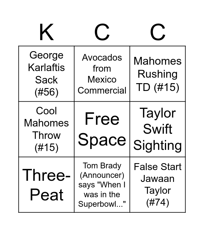 This bingo card has a free space and 8 words: Taylor Swift Sighting, Mahomes Rushing TD (#15), Avocados from Mexico Commercial, Three-Peat, George Karlaftis Sack (#56), False Start Jawaan Taylor (#74), Cool Mahomes Throw (#15) and Tom Brady (Announcer) says "When I was in the Superbowl...".