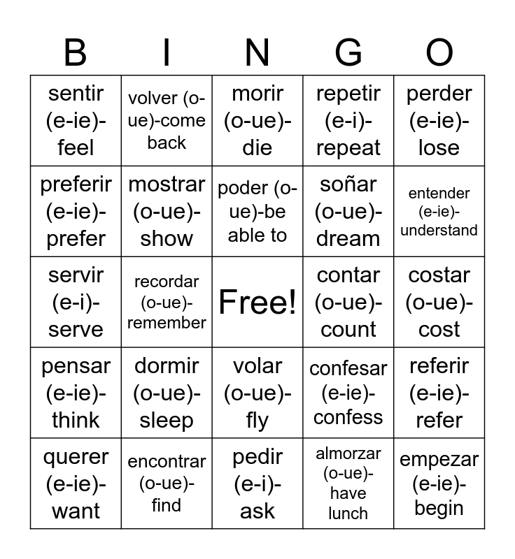 This bingo card has a free space and 29 words: querer (e-ie)-want, comenzar (e-ie)-start, recordar (o-ue)-remember, devolver (o-ue)-return, sentir (e-ie)- feel, morir (o-ue)-die, mostrar (o-ue)-show, dormir (o-ue)-sleep, contar (o-ue)-count, encontrar (o-ue)-find, costar (o-ue)-cost, empezar (e-ie)-begin, pedir (e-i)-ask, almorzar (o-ue)-have lunch, entender (e-ie)-understand, defender (e-ie)-defend, volar (o-ue)-fly, pensar (e-ie)-think, perder (e-ie)-lose, servir (e-i)-serve, confesar (e-ie)-confess, resolver (o-ue)-solve, soñar (o-ue)-dream, preferir (e-ie)-prefer, repetir (e-i)-repeat, volver (o-ue)-come back, referir (e-ie)-refer, poder (o-ue)-be able to and cerrar (e-ie)-close.