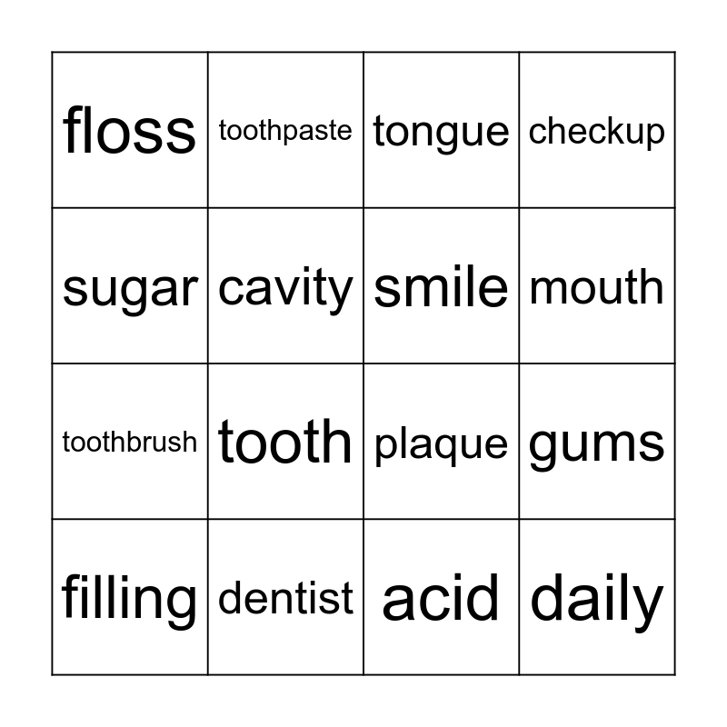 This bingo card has 16 words: dentist, gums, tongue, floss, toothbrush, toothpaste, plaque, acid, sugar, cavity, filling, checkup, tooth, mouth, smile and daily.
