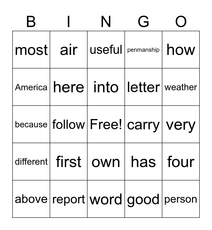This bingo card has a free space and 33 words: both, example, follow, my, different, here, how, above, air, head, into, useful, cutting, fabric, carry, weather, report, because, first, has, own, come, most, very, word, person, penmanship, letter, America, four, give, good and large.