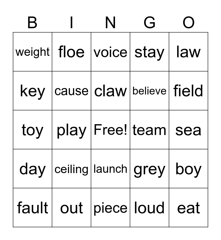 This bingo card has a free space and 39 words: mail, train, wait, cause, fault, launch, claw, draw, law, day, play, stay, eat, sea, team, ceiling, receive, weight, they, grey, key, piece, believe, field, boat, coat, road, toe, doe, floe, oil, coin, voice, out, loud, house, boy, toy and enjoy.