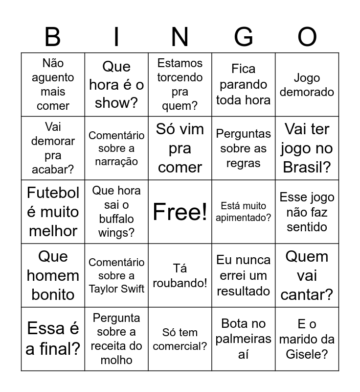 This bingo card has a free space and 24 words: Comentário sobre a Taylor Swift, Pergunta sobre a receita do molho, Só vim pra comer, Essa é a final?, Jogo demorado, Não aguento mais comer, Vai demorar pra acabar?, Que hora é o show?, Está muito apimentado?, Tá roubando!, Perguntas sobre as regras, Futebol é muito melhor, Eu nunca errei um resultado, Quem vai cantar?, Comentário sobre a narração, Bota no palmeiras aí, Esse jogo não faz sentido, Estamos torcendo pra quem?, Vai ter jogo no Brasil?, Que hora sai o buffalo wings?, E o marido da Gisele?, Que homem bonito, Fica parando toda hora and Só tem comercial?.